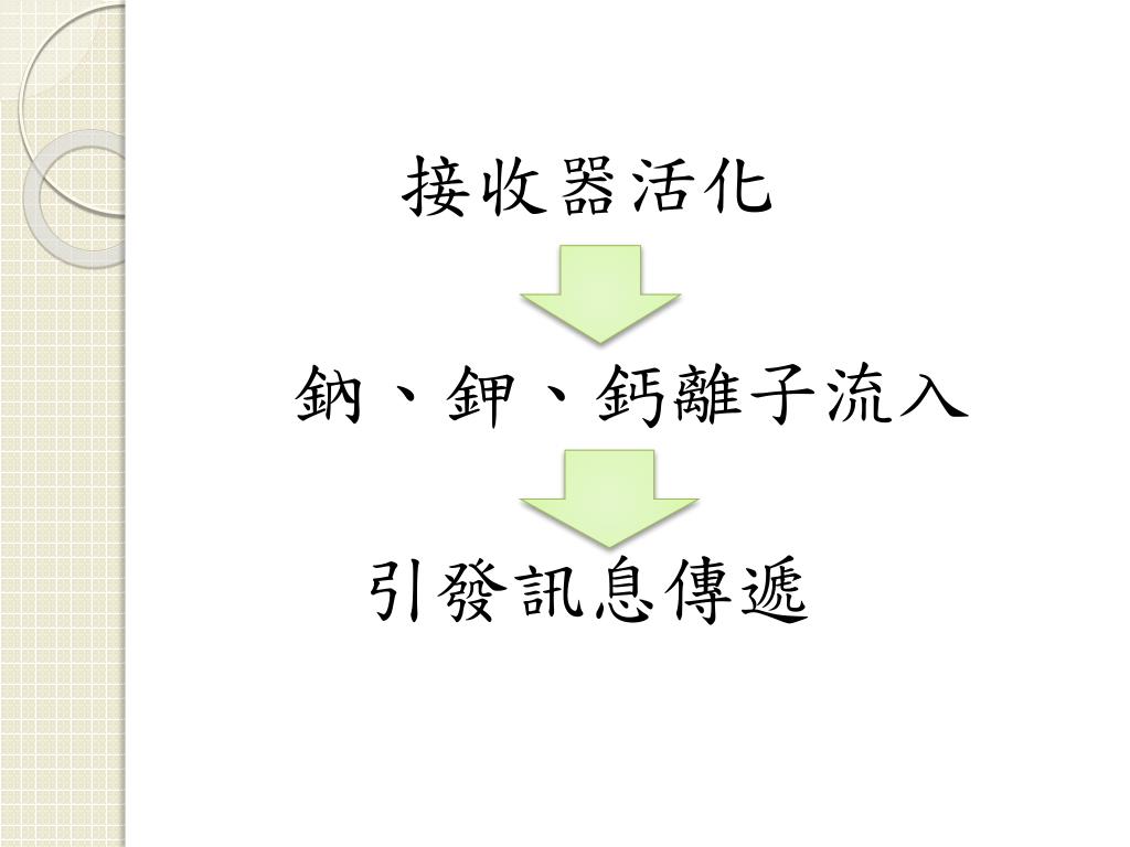 接收器活化 鈉、鉀、鈣離子流入 引發訊息傳遞