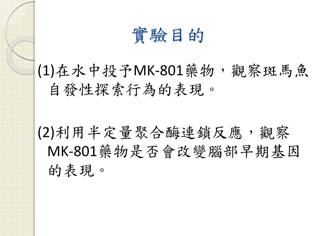 實驗目的 (1)在水中投予MK-801藥物,觀察斑馬魚自發性探索行為的表現。 (2)利用半定量聚合酶連鎖反應,觀察MK-801藥物是否會改變腦部早期基因的表現。