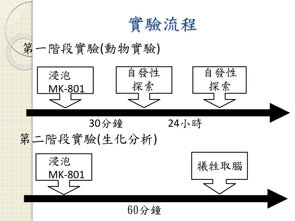 實驗流程 第一階段實驗(動物實驗) 自發性 探索 自發性 探索 浸泡 MK-801 浸泡 MK-801 30分鐘 24小時 第二階段實驗(生化分析) 犧牲取腦 60分鐘