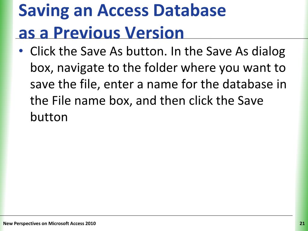 Saving an Access Database as a Previous Version • Click the Save As button. In the Save As dialog box, navigate to the folder where you want to save the file, enter a name for the database in the File name box, and then click the Save button New Perspectives on Microsoft Access 2010