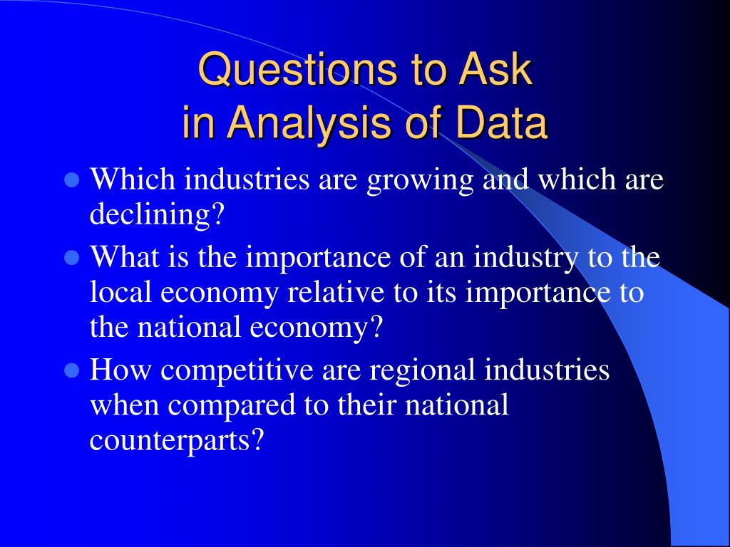 Questions to Ask in Analysis of Data • Which industries are growing and which are declining? • What is the importance of an industry to the local economy relative to its importance to the national economy? • How competitive are regional industries when compared to their national counterparts?