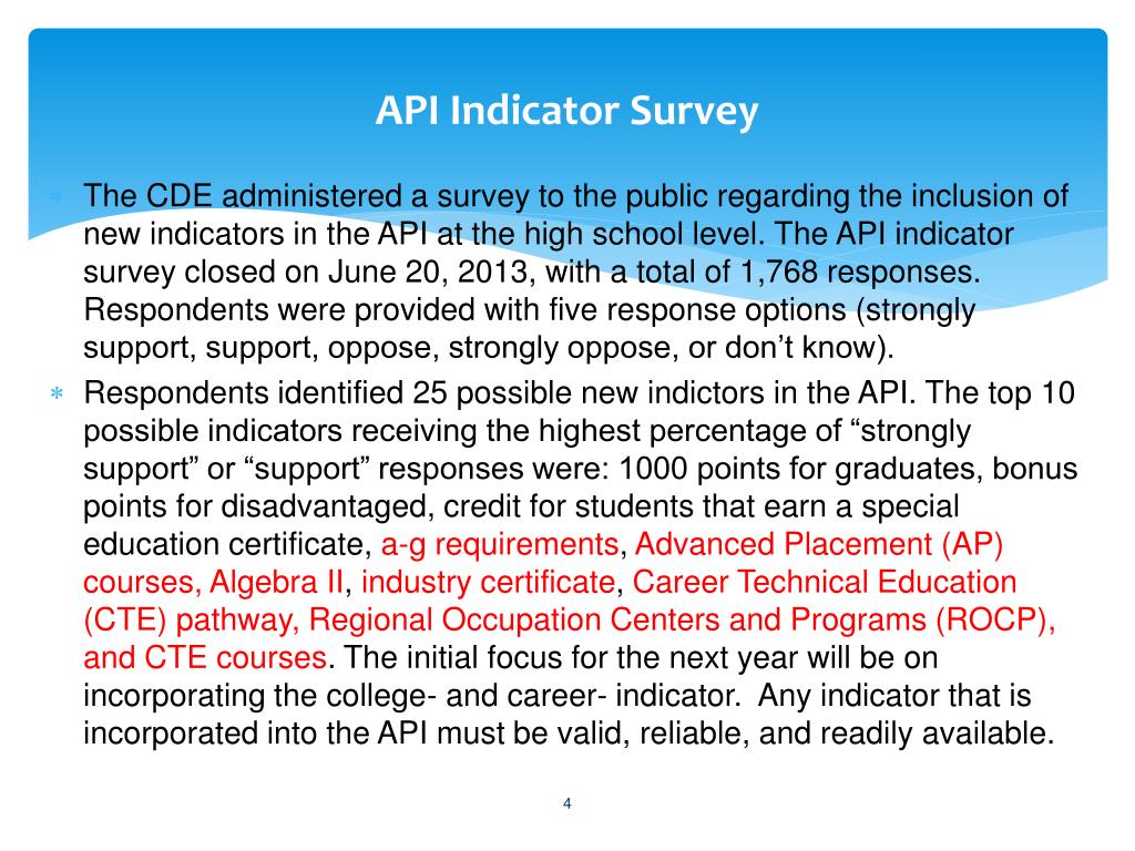API Indicator Survey The CDE administered a survey to the public regarding the inclusion of new indicators in the API at the high school level. The API indicator survey closed on June 20, 2013, with a total of 1,768 responses. Respondents were provided with five response options (strongly support, support, oppose, strongly oppose, or don’t know). Respondents identified 25 possible new indictors in the API. The top 10 possible indicators receiving the highest percentage of “strongly support” or “support” responses were: 1000 points for graduates, bonus points for disadvantaged, credit for students that earn a special education certificate, a-g requirements, Advanced Placement (AP) courses, Algebra II, industry certificate, Career Technical Education (CTE) pathway, Regional Occupation Centers and Programs (ROCP), and CTE courses. The initial focus for the next year will be on incorporating the college- and career- indicator. Any indicator that is incorporated into the API must be valid, reliable, and readily available.