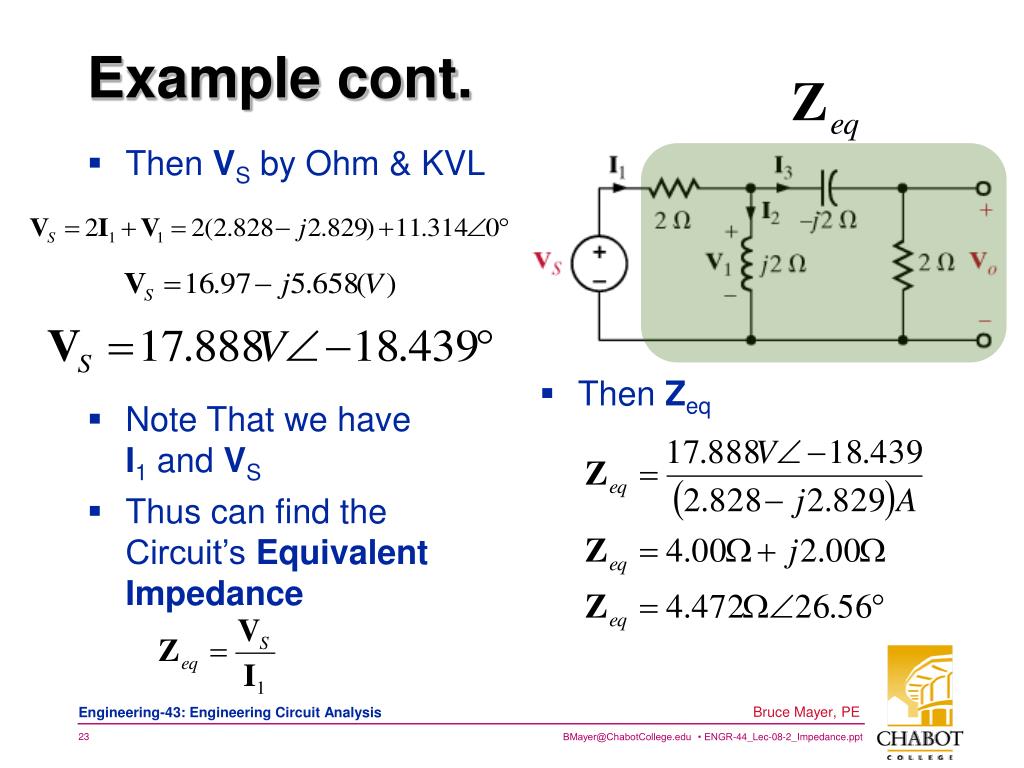 Then VS by Ohm & KVL Example cont. • Then Zeq • Note That we haveI1 and VS • Thus can find the Circuit’s Equivalent Impedance