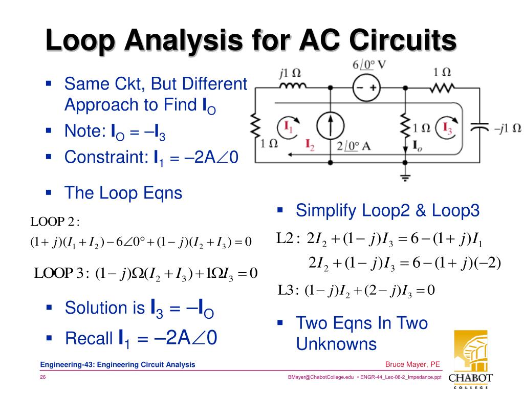 Same Ckt, But Different Approach to Find IO Note: IO = –I3 Constraint: I1 = –2A0 Loop Analysis for AC Circuits • The Loop Eqns • Simplify Loop2 & Loop3 • Solution is I3 = –IO • Recall I1 = –2A0 • Two Eqns In Two Unknowns