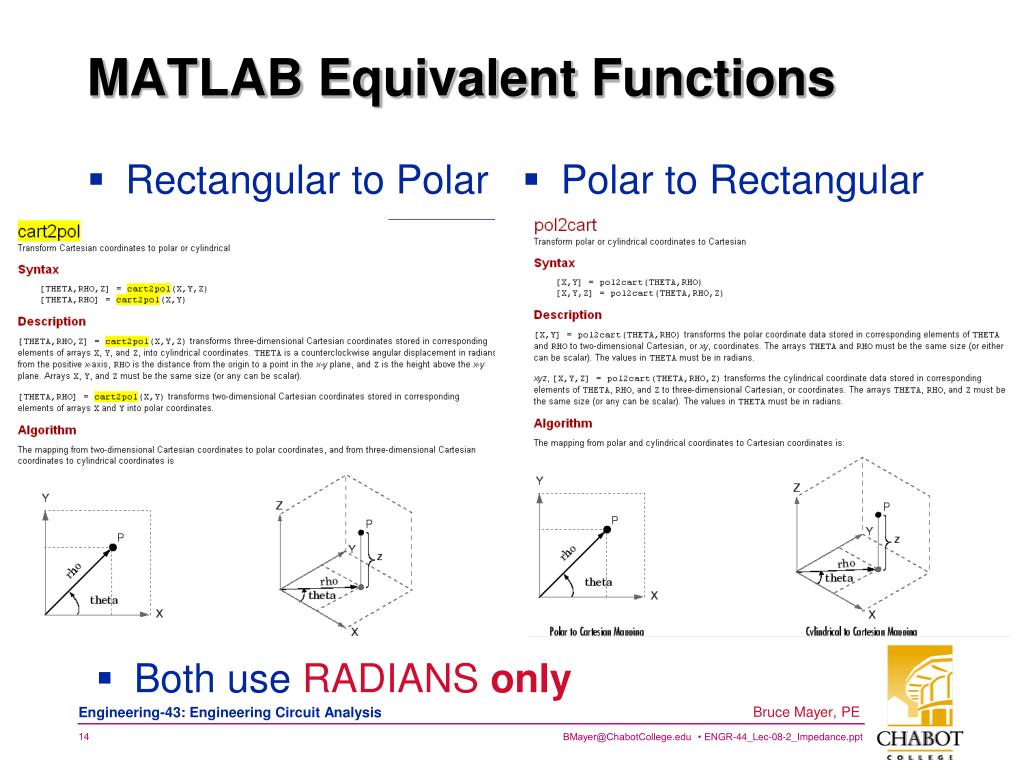 MATLAB Equivalent Functions • Rectangular to Polar • Polar to Rectangular • Both use RADIANS only