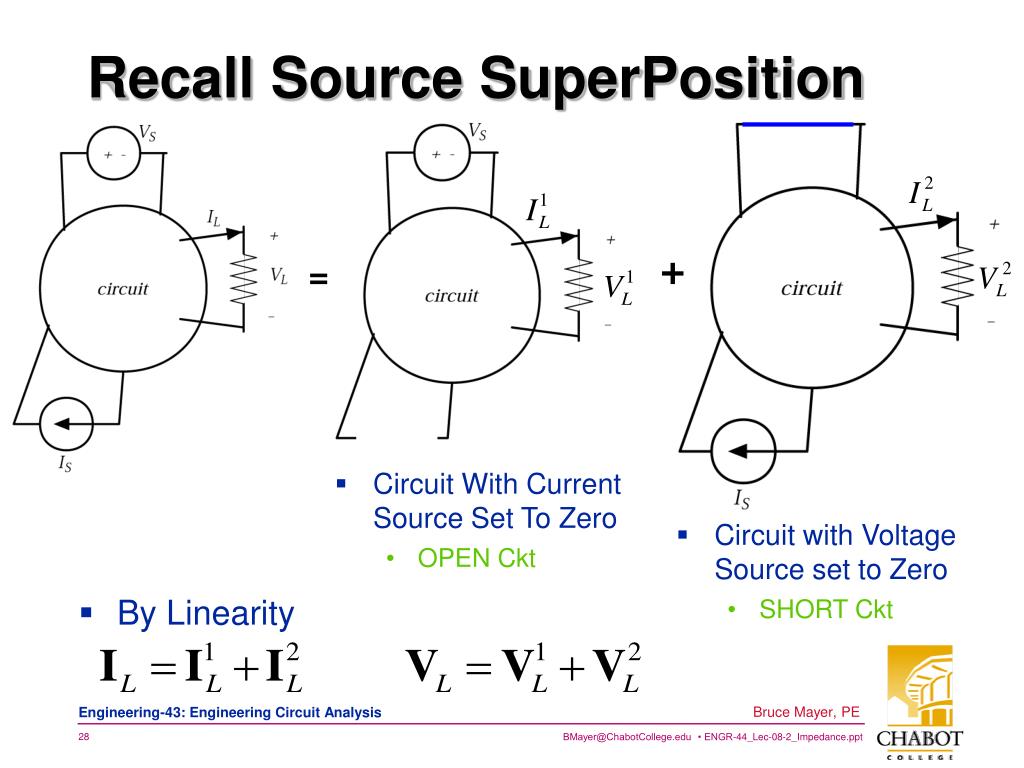 = Recall Source SuperPosition + • Circuit With Current Source Set To Zero • OPEN Ckt • Circuit with Voltage Source set to Zero • SHORT Ckt • By Linearity