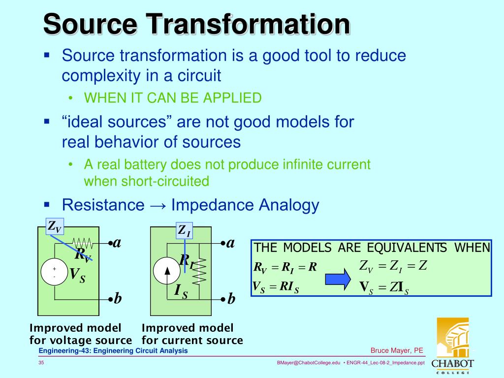 Source transformation is a good tool to reduce complexity in a circuit WHEN IT CAN BE APPLIED “ideal sources” are not good models for real behavior of sources A real battery does not produce infinite current when short-circuited Resistance → Impedance Analogy Source Transformation