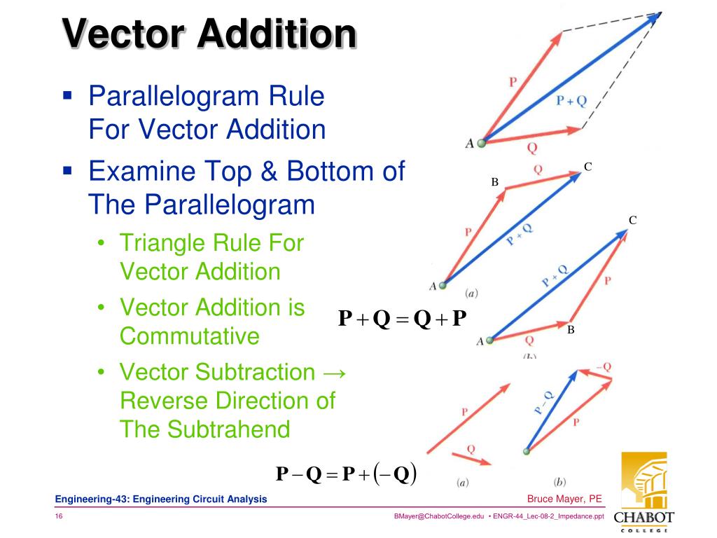 Parallelogram Rule For Vector Addition Examine Top & Bottom ofThe Parallelogram Triangle Rule ForVector Addition Vector Addition isCommutative Vector Subtraction →Reverse Direction ofThe Subtrahend C B C B Vector Addition