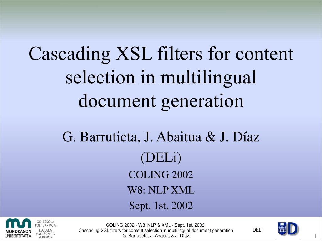 Cascading XSL filters for content selection in multilingual document generation G. Barrutieta, J. Abaitua & J. Díaz (DELi) COLING 2002 W8: NLP XML Sept. 1st, 2002