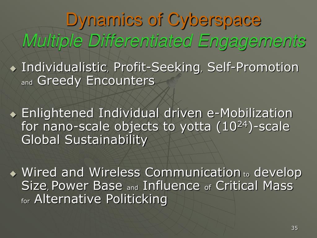 Dynamics of CyberspaceMultiple Differentiated Engagements • Individualistic, Profit-Seeking, Self-Promotion and Greedy Encounters • Enlightened Individual driven e-Mobilization for nano-scale objects to yotta (1024)-scale Global Sustainability • Wired and Wireless Communication to develop Size, Power Base and Influence of Critical Mass for Alternative Politicking