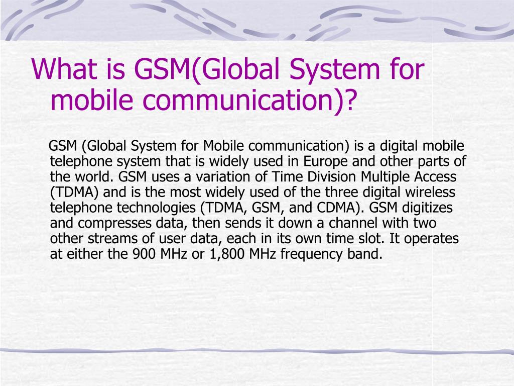 What is GSM(Global System for mobile communication)? GSM (Global System for Mobile communication) is a digital mobile telephone system that is widely used in Europe and other parts of the world. GSM uses a variation of Time Division Multiple Access (TDMA) and is the most widely used of the three digital wireless telephone technologies (TDMA, GSM, and CDMA). GSM digitizes and compresses data, then sends it down a channel with two other streams of user data, each in its own time slot. It operates at either the 900 MHz or 1,800 MHz frequency band.