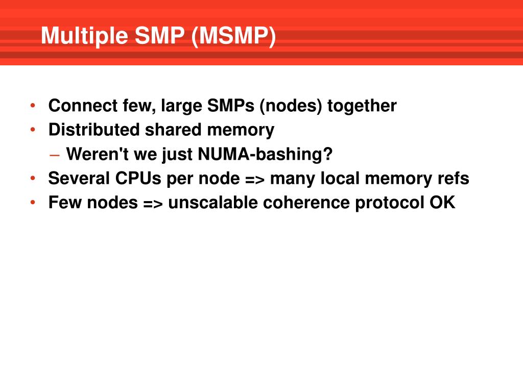 Multiple SMP (MSMP) • Connect few, large SMPs (nodes) together • Distributed shared memory • Weren't we just NUMA-bashing? • Several CPUs per node => many local memory refs • Few nodes => unscalable coherence protocol OK