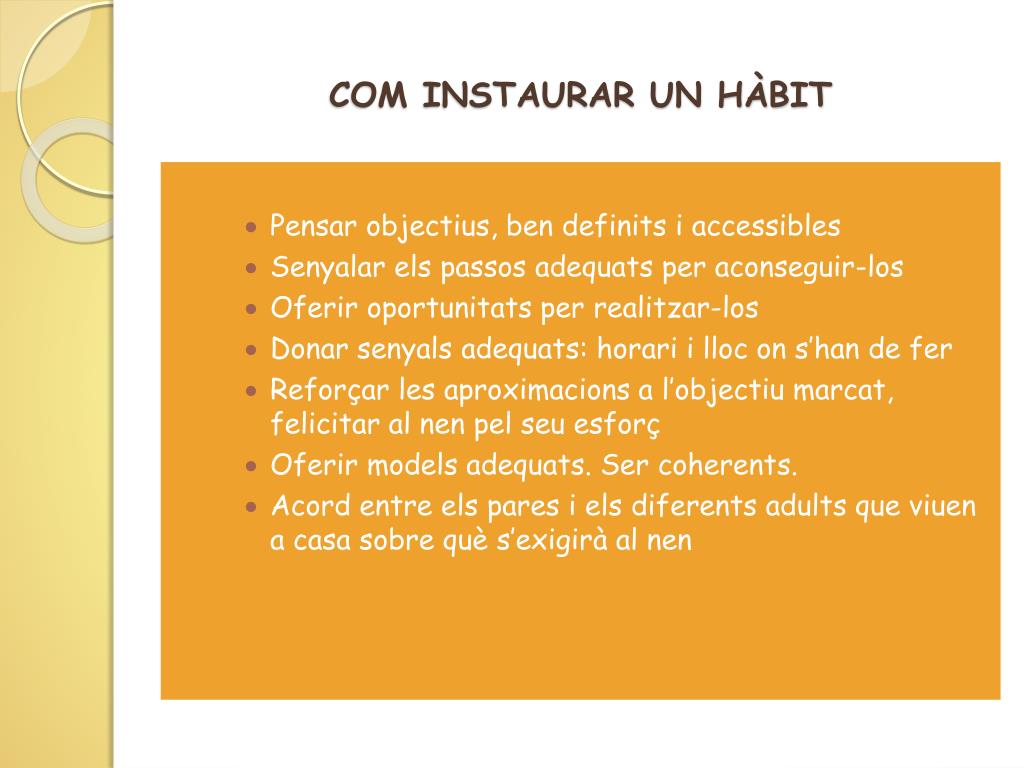 COM INSTAURAR UN HÀBIT • Pensar objectius, ben definits i accessibles • Senyalar els passos adequats per aconseguir-los • Oferir oportunitats per realitzar-los • Donar senyals adequats: horari i lloc on s’han de fer • Reforçar les aproximacions a l’objectiu marcat, felicitar al nen pel seu esforç • Oferir models adequats. Ser coherents. • Acord entre els pares i els diferents adults que viuen a casa sobre què s’exigirà al nen