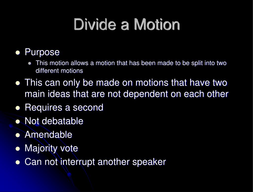 Divide a Motion Purpose This motion allows a motion that has been made to be split into two different motions This can only be made on motions that have two main ideas that are not dependent on each other Requires a second Not debatable Amendable Majority vote Can not interrupt another speaker