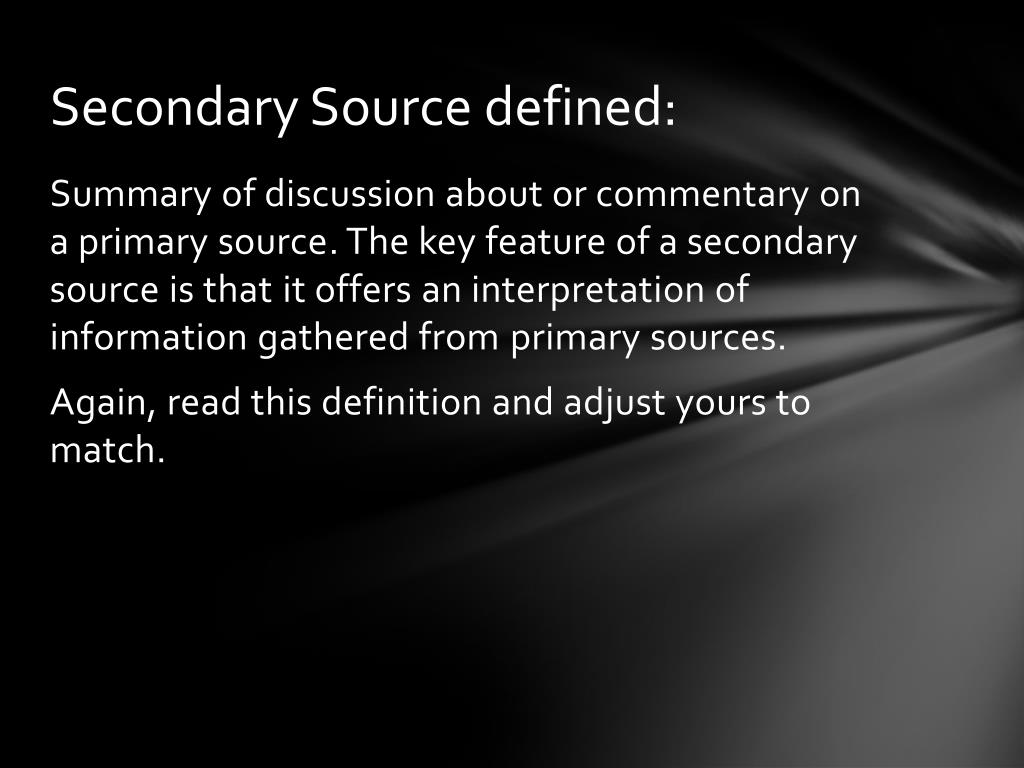 Secondary Source defined: • Summary of discussion about or commentary on a primary source. The key feature of a secondary source is that it offers an interpretation of information gathered from primary sources. • Again, read this definition and adjust yours to match.