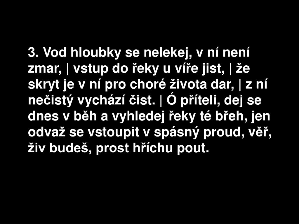 3. Vod hloubky se nelekej, v ní není zmar, | vstup do řeky u víře jist, | že skryt je v ní pro choré života dar, | z ní nečistý vychází čist. | Ó příteli, dej se dnes v běh a vyhledej řeky té břeh, jen odvaž se vstoupit v spásný proud, věř, živ budeš, prost hříchu pout.