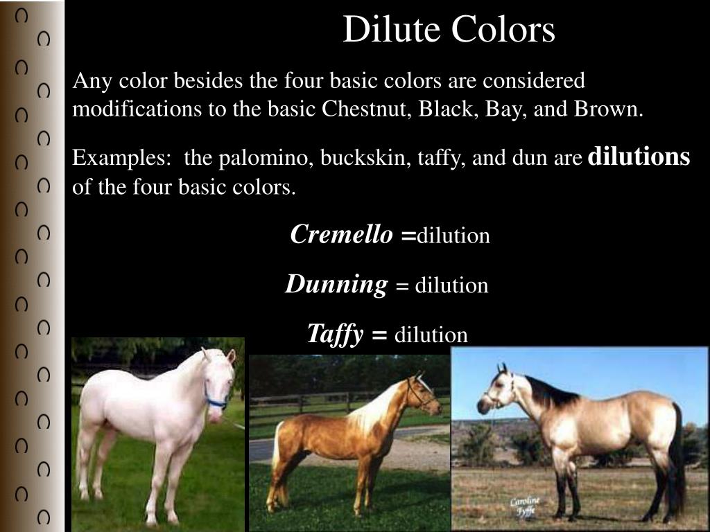 Dilute Colors Any color besides the four basic colors are considered modifications to the basic Chestnut, Black, Bay, and Brown. Examples: the palomino, buckskin, taffy, and dun are dilutions of the four basic colors. Cremello =dilution Dunning = dilution Taffy = dilution