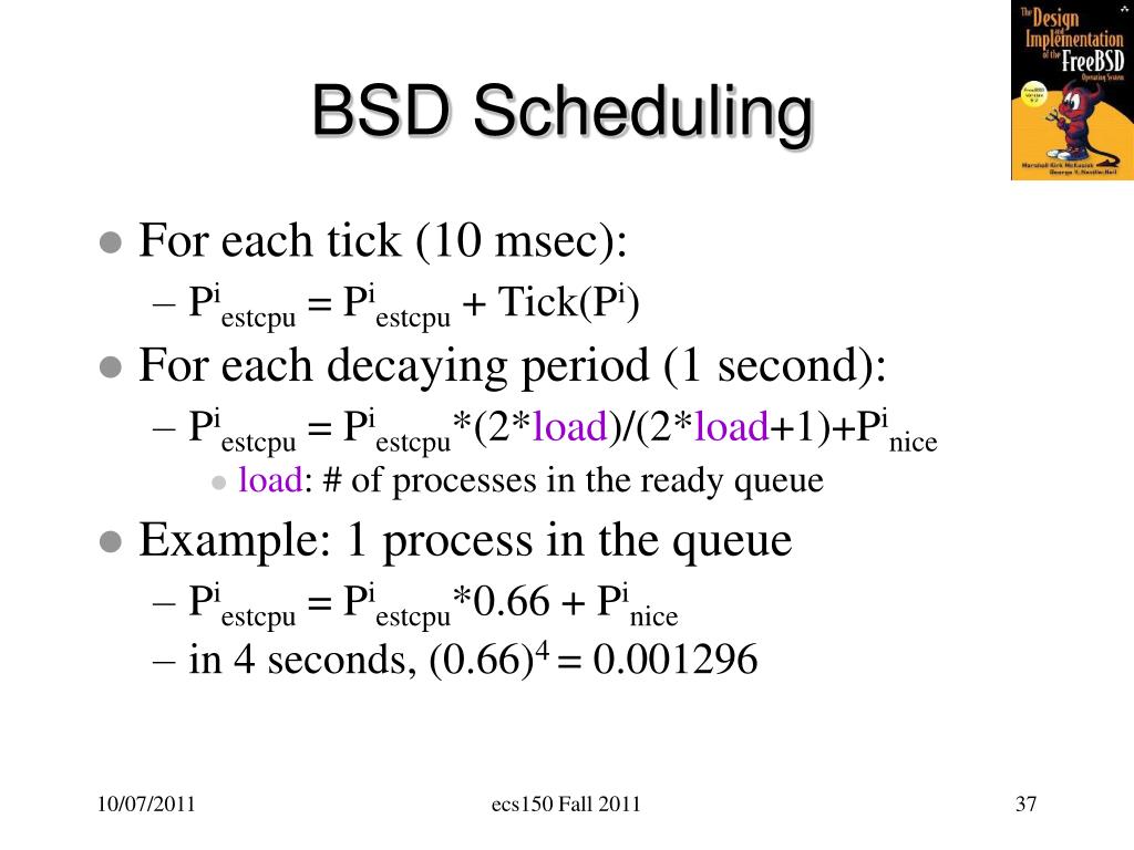 /usr/src/sys/kern/sched_4bsd.c #define loadfactor(loadav) (2 * (loadav)) #define decay_cpu(loadfac, cpu) (((loadfac) * (cpu)) / ((loadfac) + FSCALE)) static fixpt_t ccpu = 0.95122942450071400909 * FSCALE; #define CCPU_SHIFT 11 ecs150 Fall 2011