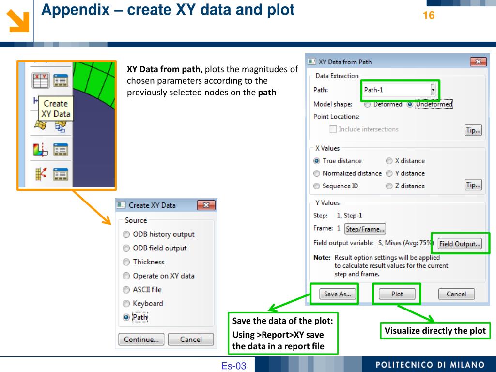 Appendix – create XY data and plot XY Data from path, plots the magnitudes of chosen parameters according to the previously selected nodes on the path Save the data of the plot: Using >Report>XY save the data in a report file Visualize directly the plot