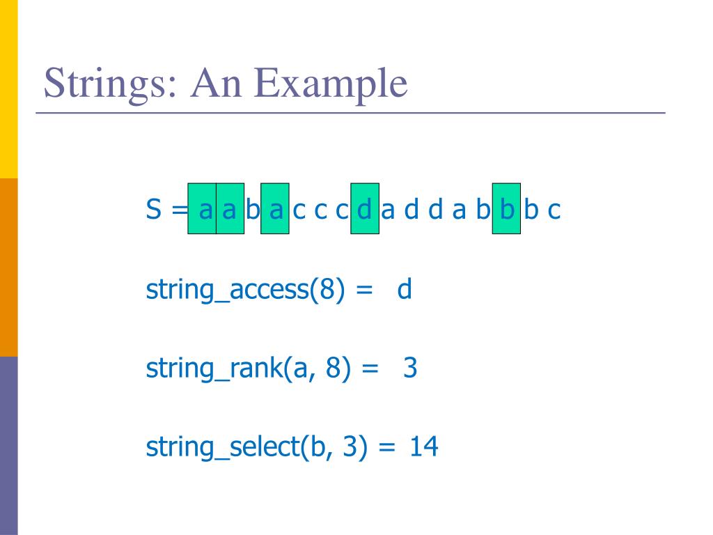 Strings: An Example S = a a b a c cc d a d d a b bb c string_access(8) = d string_rank(a, 8) = 3 string_select(b, 3) = 14