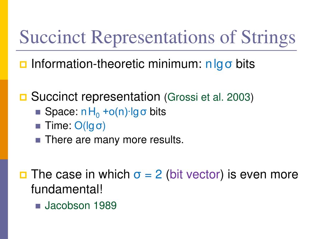 Succinct Representations of Strings • Information-theoretic minimum: nlgσbits • Succinct representation (Grossi et al. 2003) • Space: nH0+o(n)∙lgσ bits • Time: O(lgσ) • There are many more results. • The case in which σ = 2 (bit vector) is even more fundamental! • Jacobson 1989
