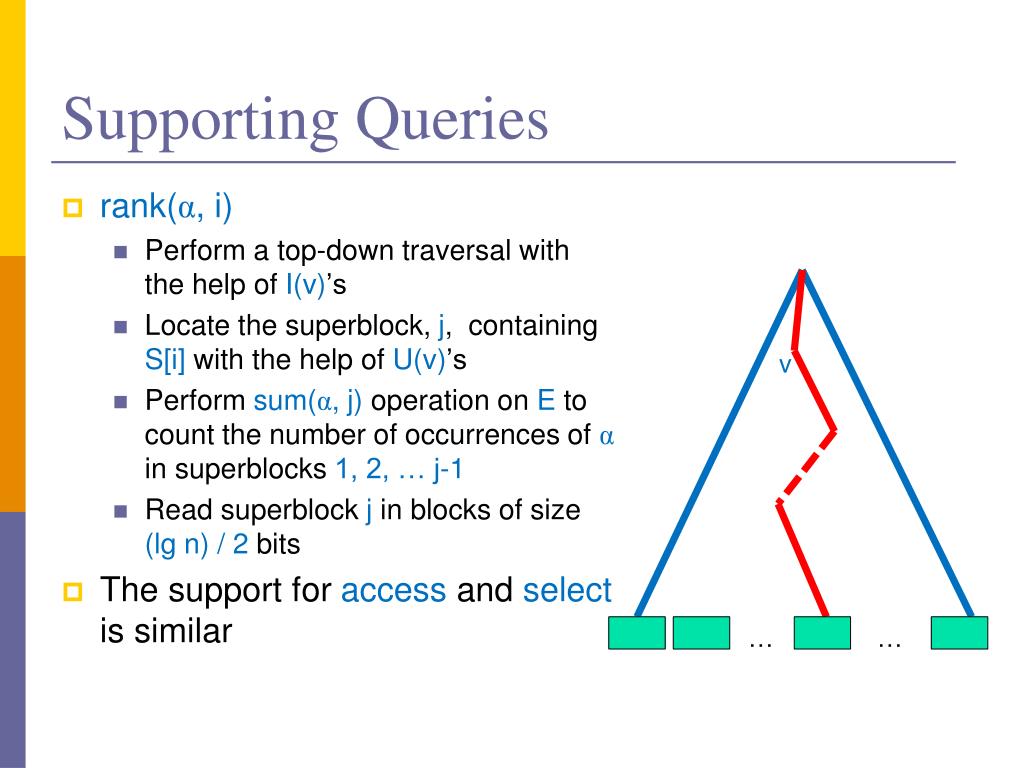 Supporting Queries • rank(α, i) • Perform a top-down traversal with the help of I(v)’s • Locate the superblock, j, containing S[i] with the help of U(v)’s • Perform sum(α, j) operation on E to count the number of occurrences of αin superblocks 1, 2, … j-1 • Read superblock j in blocks of size (lg n) / 2 bits • The support for access and select is similar v … …