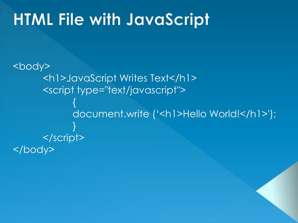<body> <h1>JavaScript Writes Text</h1> <script type="text/javascript"> { document.write (‘<h1>Hello World!</h1>'); } </script> </body> HTML File with JavaScript