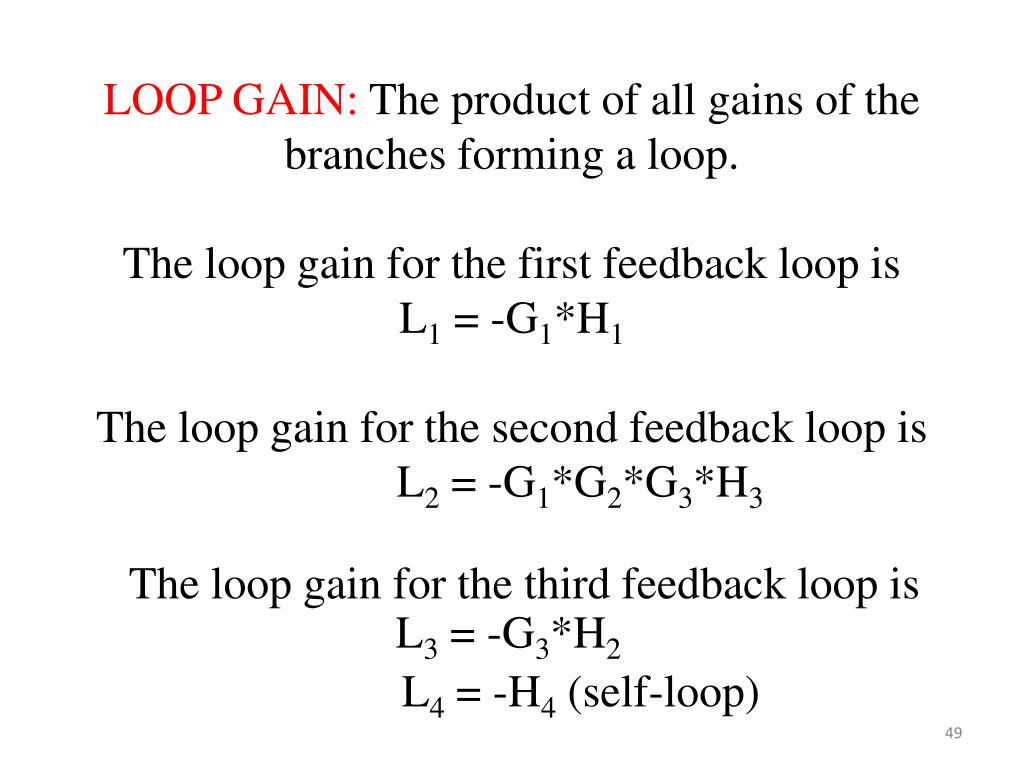 LOOP GAIN: The product of all gains of the branches forming a loop.The loop gain for the first feedback loop isL1 = -G1*H1The loop gain for the second feedback loop is L2 = -G1*G2*G3*H3 The loop gain for the third feedback loop is L3 = -G3*H2 L4 = -H4 (self-loop)