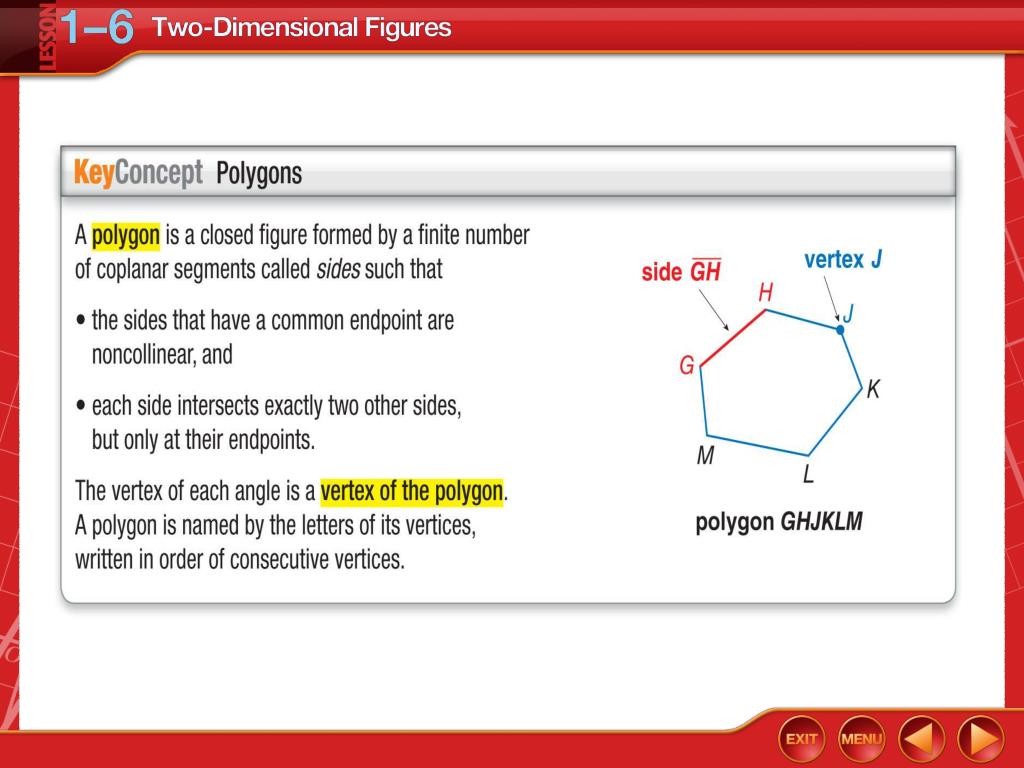 You measured one-dimensional figures. • Identify and name polygons. • Find perimeter, circumference, and area of two-dimensional figures. Then/Now