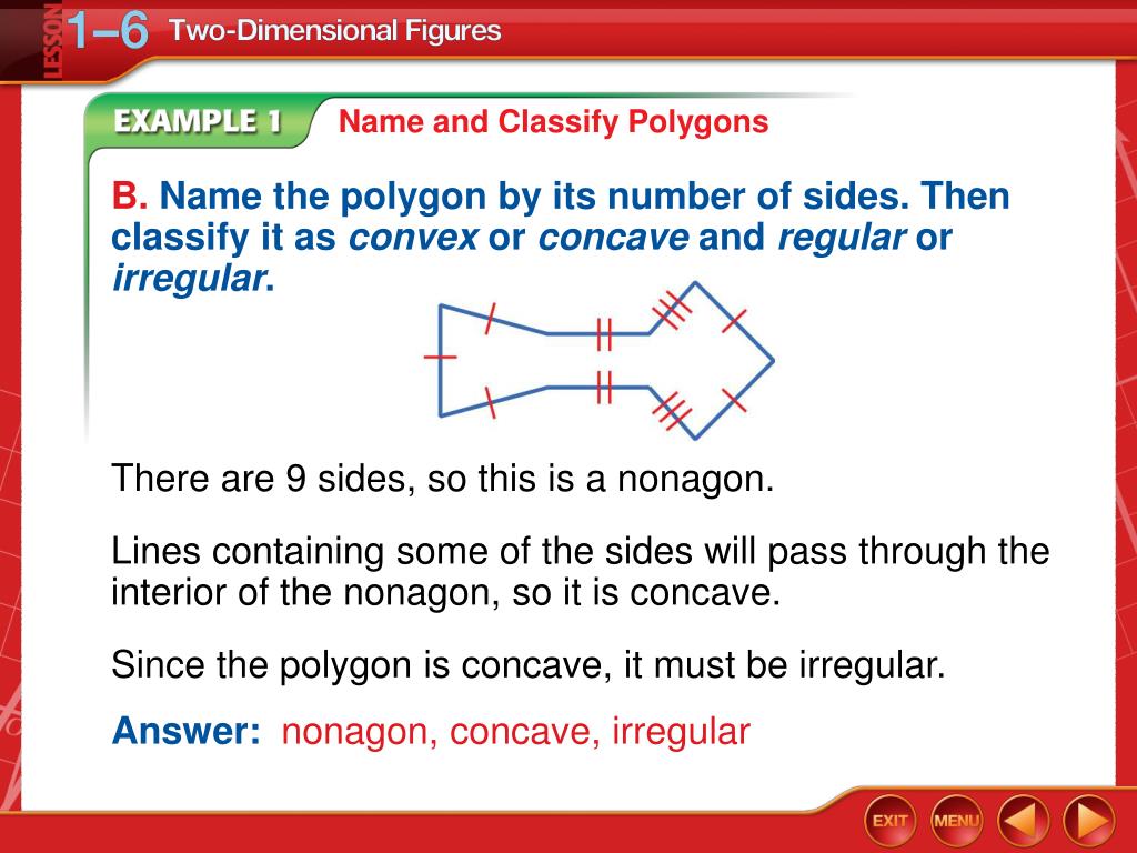 Name and Classify Polygons B. Name the polygon by its number of sides. Then classify it as convex or concave and regular or irregular. There are 9 sides, so this is a nonagon. Lines containing some of the sides will pass through the interior of the nonagon, so it is concave. Since the polygon is concave, it must be irregular. Answer: nonagon, concave, irregular Example 1