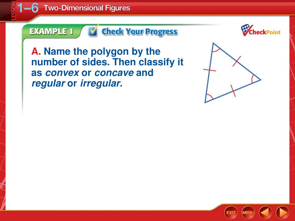 Name and Classify Polygons A. Name the polygon by its number of sides. Then classify it as convex or concave and regular or irregular. There are 4 sides, so this is a quadrilateral. No line containing any of the sides will pass through the interior of the quadrilateral, so it is convex. The sides are not congruent, so it is irregular. Answer: quadrilateral, convex, irregular Example 1