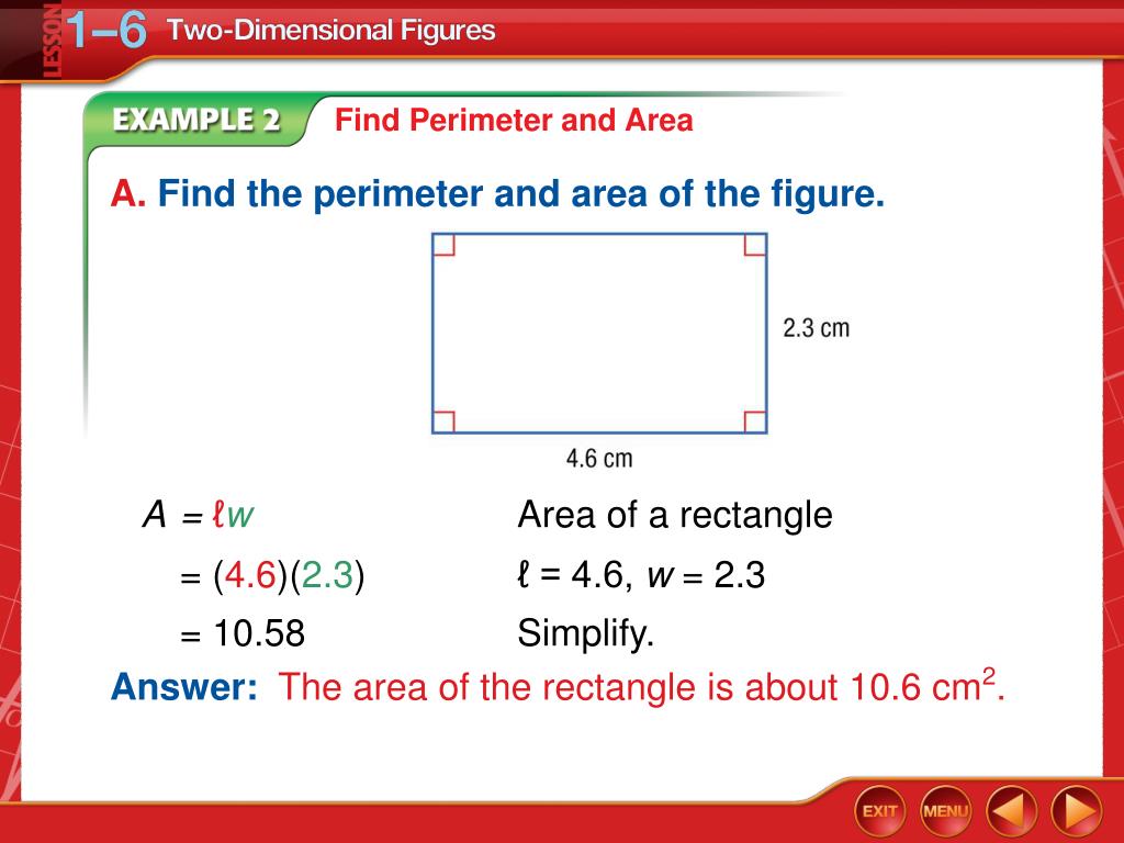 Find Perimeter and Area A.Find the perimeter and area of the figure. A = ℓw Area of a rectangle = (4.6)(2.3) ℓ = 4.6, w = 2.3 = 10.58 Simplify. Answer: The area of the rectangle is about 10.6 cm2. Example 2