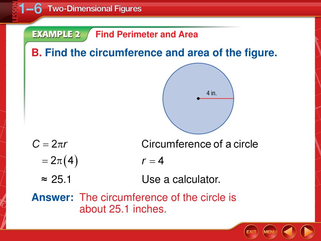 Find Perimeter and Area B.Find the circumference and area of the figure. ≈ 25.1 Use a calculator. Answer: The circumference of the circle is about 25.1 inches. Example 2