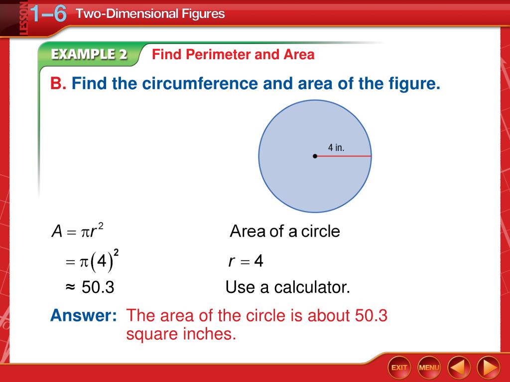 Find Perimeter and Area B.Find the circumference and area of the figure. ≈ 50.3 Use a calculator. Answer: The area of the circle is about 50.3 square inches. Example 2