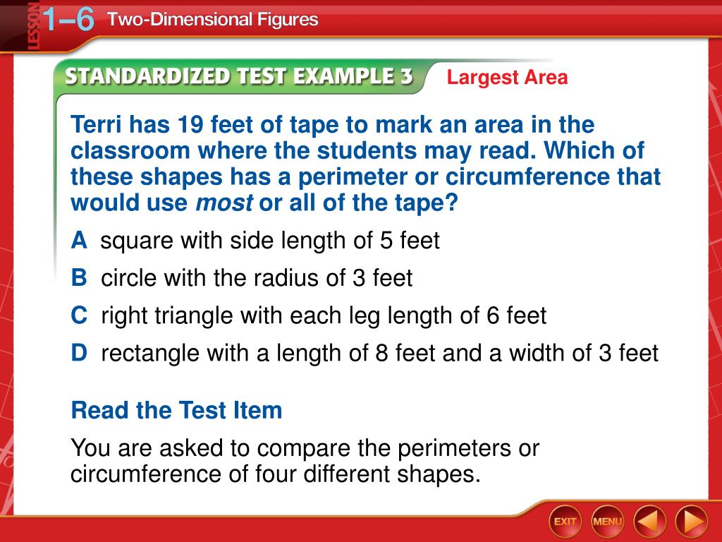Largest Area Terri has 19 feet of tape to mark an area in the classroom where the students may read. Which of these shapes has a perimeter or circumference that would use most or all of the tape? A square with side length of 5 feet B circle with the radius of 3 feet C right triangle with each leg length of 6 feet D rectangle with a length of 8 feet and a width of 3 feet Read the Test Item You are asked to compare the perimeters orcircumference of four different shapes. Example 3