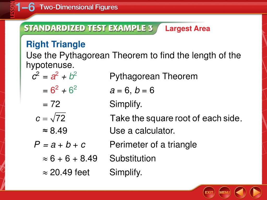 . Largest Area Right Triangle Use the Pythagorean Theorem to find the length of the hypotenuse. c2 = a2+b2 Pythagorean Theorem = 62+62a = 6, b = 6 = 72 Simplify. ≈ 8.49 Use a calculator. P = a + b + c Perimeter of a triangle 6 + 6 + 8.49 Substitution 20.49 feet Simplify. Example 3
