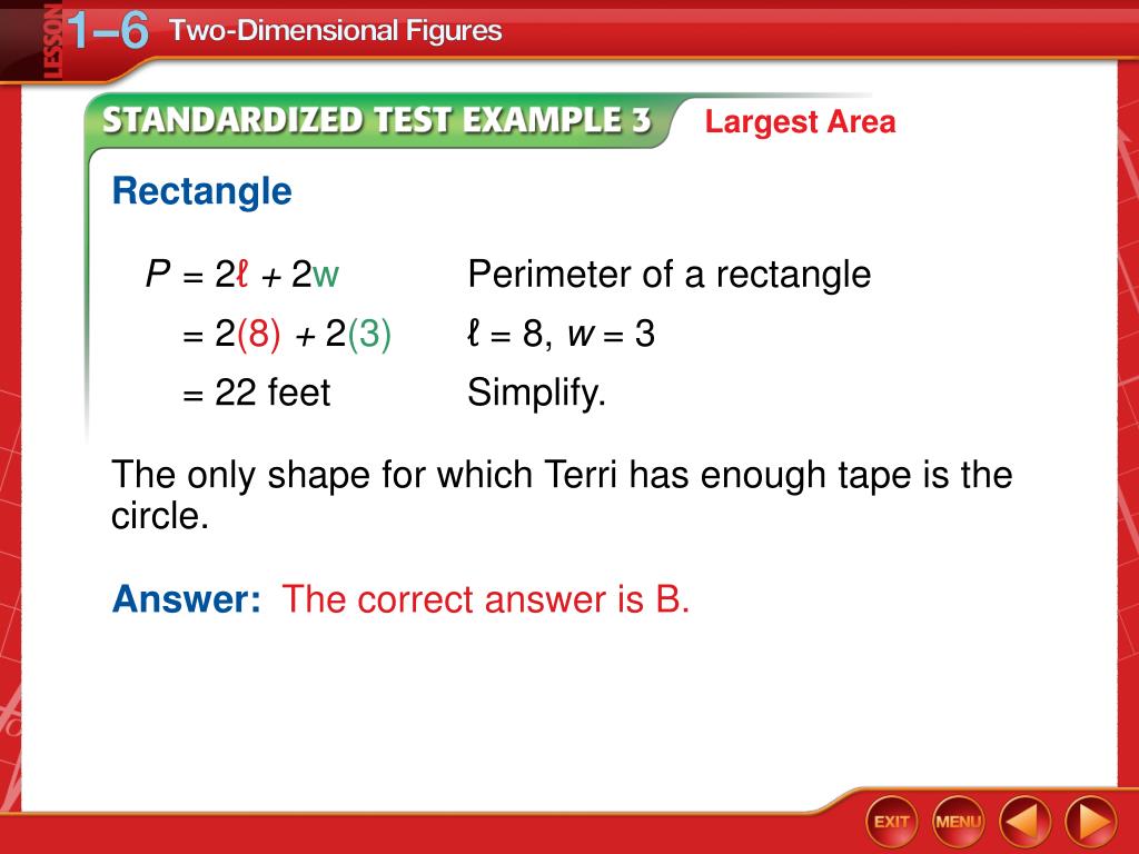 Largest Area Rectangle P = 2ℓ+2w Perimeter of a rectangle = 2(8)+2(3)ℓ = 8, w = 3 = 22 feet Simplify. The only shape for which Terri has enough tape is the circle. Answer: The correct answer is B. Example 3