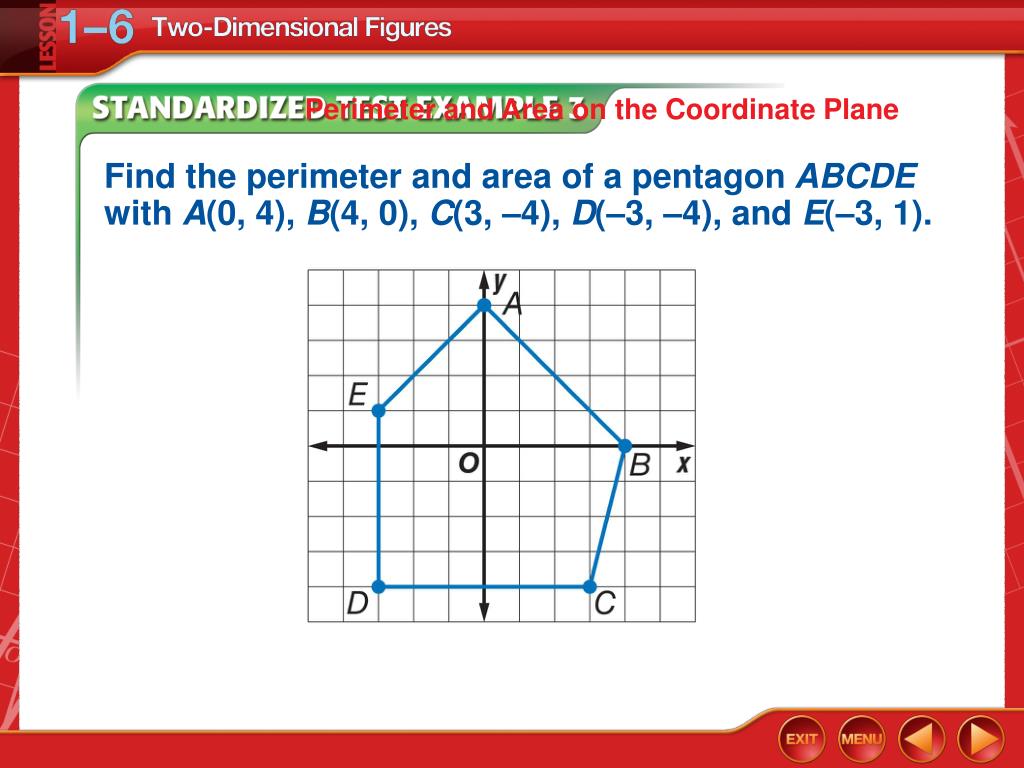 Perimeter and Area on the Coordinate Plane Find the perimeter and area of a pentagon ABCDE with A(0, 4), B(4, 0), C(3, –4), D(–3, –4), and E(–3, 1). Example 4