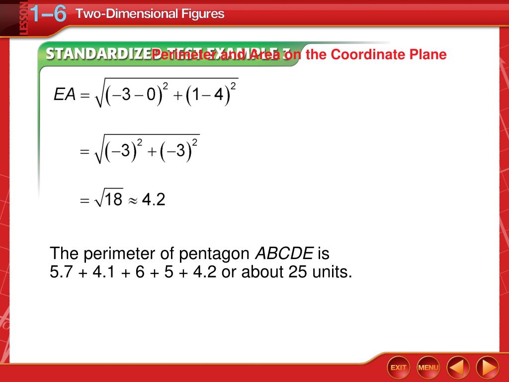 By counting squares on the grid, we find that CD = 6 units and DE = 5 units. Use the Distance Formula, to find AB, BC, and EA. Perimeter and Area on the Coordinate Plane Step 1 Example 4