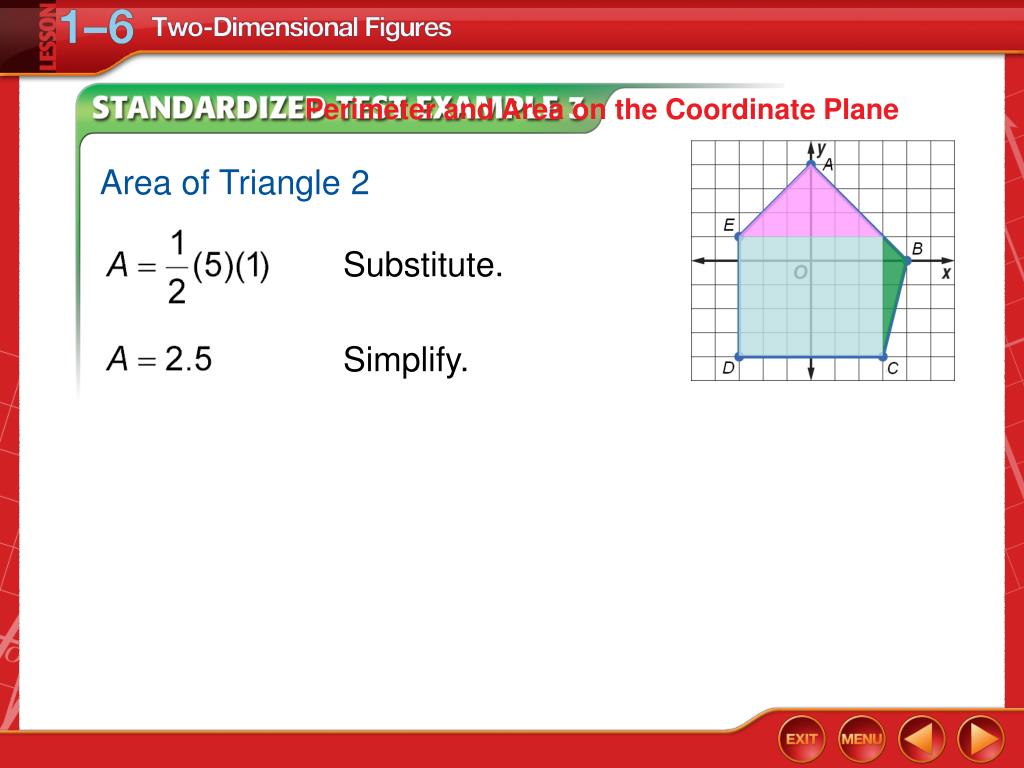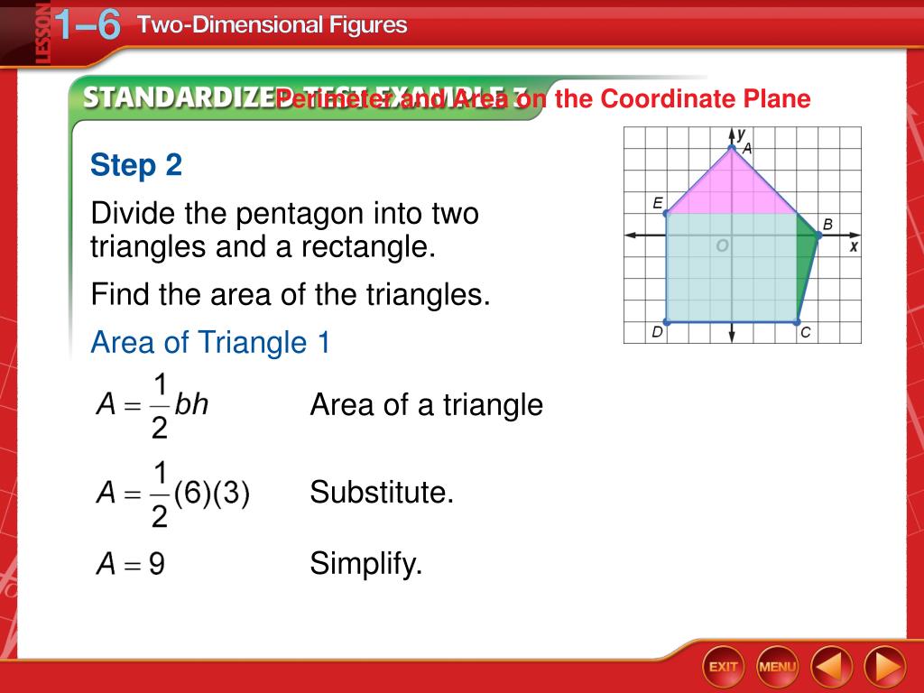 Perimeter and Area on the Coordinate Plane Step 2 Divide the pentagon into two triangles and a rectangle. Find the area of the triangles. Area of Triangle1 Area of a triangle Substitute. Simplify. Example 4