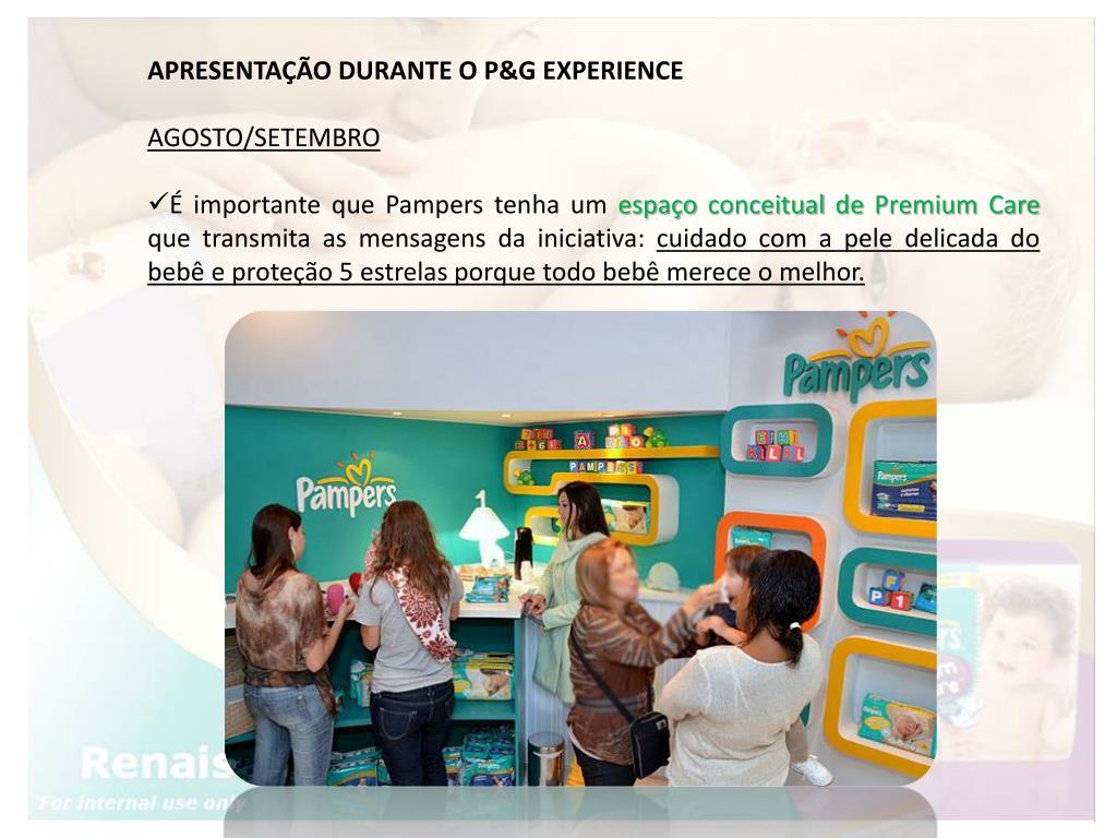 APRESENTAÇÃO DURANTE O P&G EXPERIENCE • AGOSTO/SETEMBRO • É importante que Pampers tenha um espaço conceitual de Premium Careque transmita as mensagens da iniciativa: cuidado com a pele delicada do bebê e proteção 5 estrelas porque todo bebê merece o melhor.