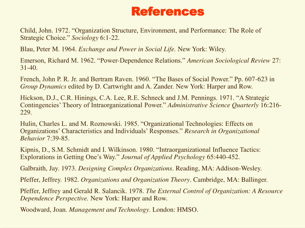 References Child, John. 1972. “Organization Structure, Environment, and Performance: The Role of Strategic Choice.” Sociology 6:1-22. Blau, Peter M. 1964. Exchange and Power in Social Life. New York: Wiley. Emerson, Richard M. 1962. “Power-Dependence Relations.” American Sociological Review 27: 31-40. French, John P. R. Jr. and Bertram Raven. 1960. “The Bases of Social Power.” Pp. 607-623 in Group Dynamics edited by D. Cartwright and A. Zander. New York: Harper and Row. Hickson, D.J., C.R. Hinings, C.A. Lee, R.E. Schneck and J.M. Pennings. 1971. “A Strategic Contingencies’ Theory of Intraorganizational Power.” Administrative Science Quarterly 16:216-229. Hulin, Charles L. and M. Roznowski. 1985. “Organizational Technologies: Effects on Organizations’ Characteristics and Individuals’ Responses.” Research in Organizational Behavior 7:39-85. Kipnis, D., S.M. Schmidt and I. Wilkinson. 1980. “Intraorganizational Influence Tactics: Explorations in Getting One’s Way.” Journal of Applied Psychology 65:440-452. Galbraith, Jay. 1973. Designing Complex Organizations. Reading, MA: Addison-Wesley. Pfeffer, Jeffrey. 1982. Organizations and Organization Theory. Cambridge, MA: Ballinger. Pfeffer, Jeffrey and Gerald R. Salancik. 1978. The External Control of Organization: A Resource Dependence Perspective. New York: Harper and Row. Woodward, Joan. Management and Technology. London: HMSO.