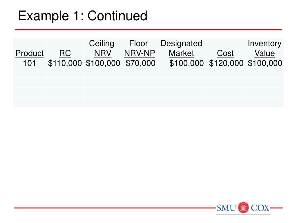 Determining Market Value Step 1Determine Designated Market Step 2Compare Designated Market with Cost CeilingNRV Not More Than DesignatedMarket Cost ReplacementCost Or Not Less Than Lower of CostOr Market NRV – NPFloor