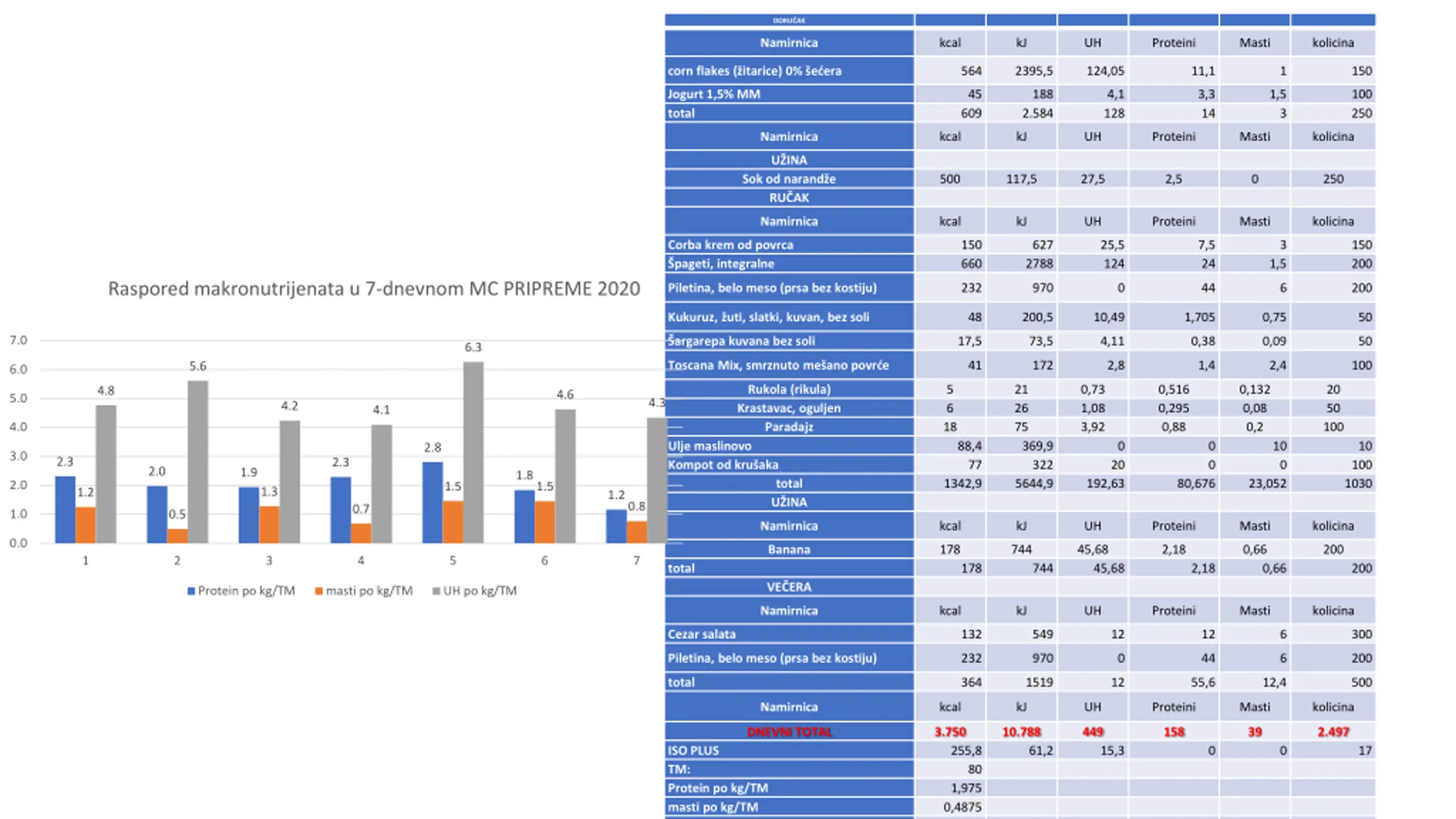 17. DORUČAK Namirnica kcal kJ UH Proteini Masti kolicina corn flakes (žitarice) 0% šećera 564 2395,5 124,05 11,1 1 150 Jogurt 1,5% MM total 45 609 188 2.584 4,1 128 3,3 14 1,5 100 250 3 Namirnica kcal kJ UH Proteini Masti kolicina UŽINA Sok od narandže RUČAK 500 117,5 27,5 2,5 0 250 Namirnica kcal kJ UH Proteini Masti kolicina Corba krem od povrca Špageti, integralne 150 660 627 2788 25,5 124 7,5 24 3 150 200 1,5 Raspored makronutrijenata u 7-dnevnom MC PRIPREME 2020 Piletina, belo meso (prsa bez kostiju) 232 970 0 44 6 200 Kukuruz, žuti, slatki, kuvan, bez soli 48 200,5 10,49 1,705 0,75 50 7.0 Šargarepa kuvana bez soli 17,5 73,5 4,11 0,38 0,09 50 6.3 Toscana Mix, smrznuto mešano povrće 41 172 2,8 1,4 2,4 100 5.6 6.0 Rukola (rikula) Krastavac, oguljen Paradajz 5 6 18 21 26 75 0,73 1,08 3,92 0,516 0,295 0,88 0,132 0,08 0,2 20 50 100 4.8 4.6 5.0 4.3 4.2 4.1 4.0 Ulje maslinovo Kompot od krušaka 88,4 77 369,9 322 5644,9 0 0 0 10 0 10 100 1030 2.8 3.0 2.3 2.3 20 2.0 1.9 1.8 total UŽINA 1342,9 192,63 80,676 23,052 2.0 1.5 1.5 1.3 1.2 1.2 0.8 0.7 1.0 0.5 Namirnica kcal kJ UH Proteini Masti kolicina 0.0 Banana 178 744 45,68 2,18 0,66 200 1 2 3 4 5 6 7 total 178 744 45,68 2,18 0,66 200 VEČERA Protein po kg/TM masti po kg/TM UH po kg/TM Namirnica kcal kJ UH Proteini Masti kolicina Cezar salata 132 549 12 12 6 300 Piletina, belo meso (prsa bez kostiju) 232 970 0 44 6 200 total 364 1519 12 55,6 12,4 500 Namirnica kcal kJ UH Proteini Masti kolicina DNEVNI TOTAL 3.750 10.788 449 158 39 2.497 ISO PLUS TM: Protein po kg/TM masti po kg/TM UH po kg/TM 255,8 61,2 15,3 0 0 17 80 1,975 0,4875