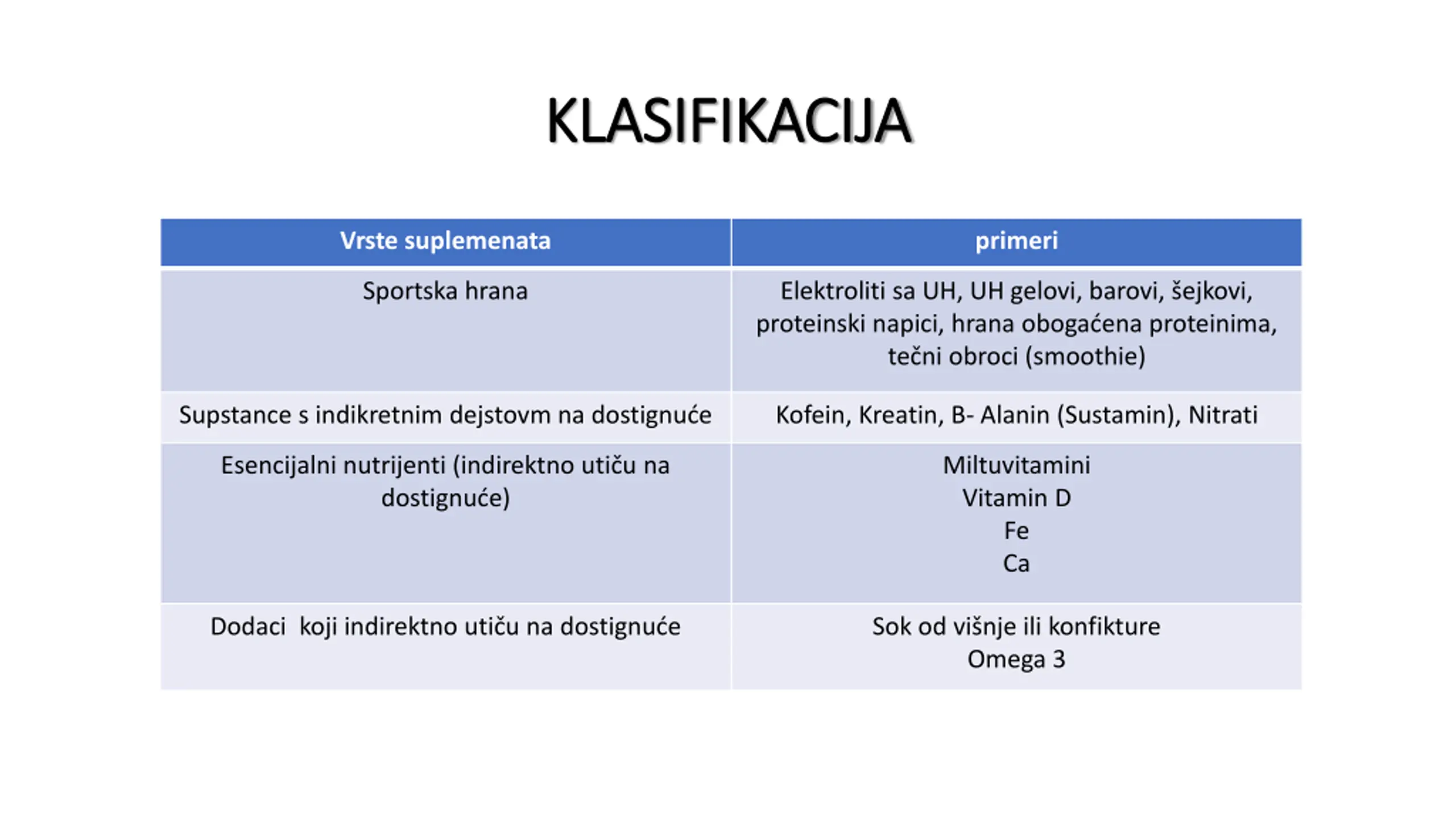14. KLASIFIKACIJA KLASIFIKACIJA Vrste suplemenata primeri Sportska hrana Elektroliti sa UH, UH gelovi, barovi, šejkovi, proteinski napici, hrana obogaćena proteinima, tečni obroci (smoothie) Supstance s indikretnim dejstovm na dostignuće Kofein, Kreatin, B- Alanin (Sustamin), Nitrati Esencijalni nutrijenti (indirektno utiču na dostignuće) Miltuvitamini Vitamin D Fe Ca Dodaci koji indirektno utiču na dostignuće Sok od višnje ili konfikture Omega 3