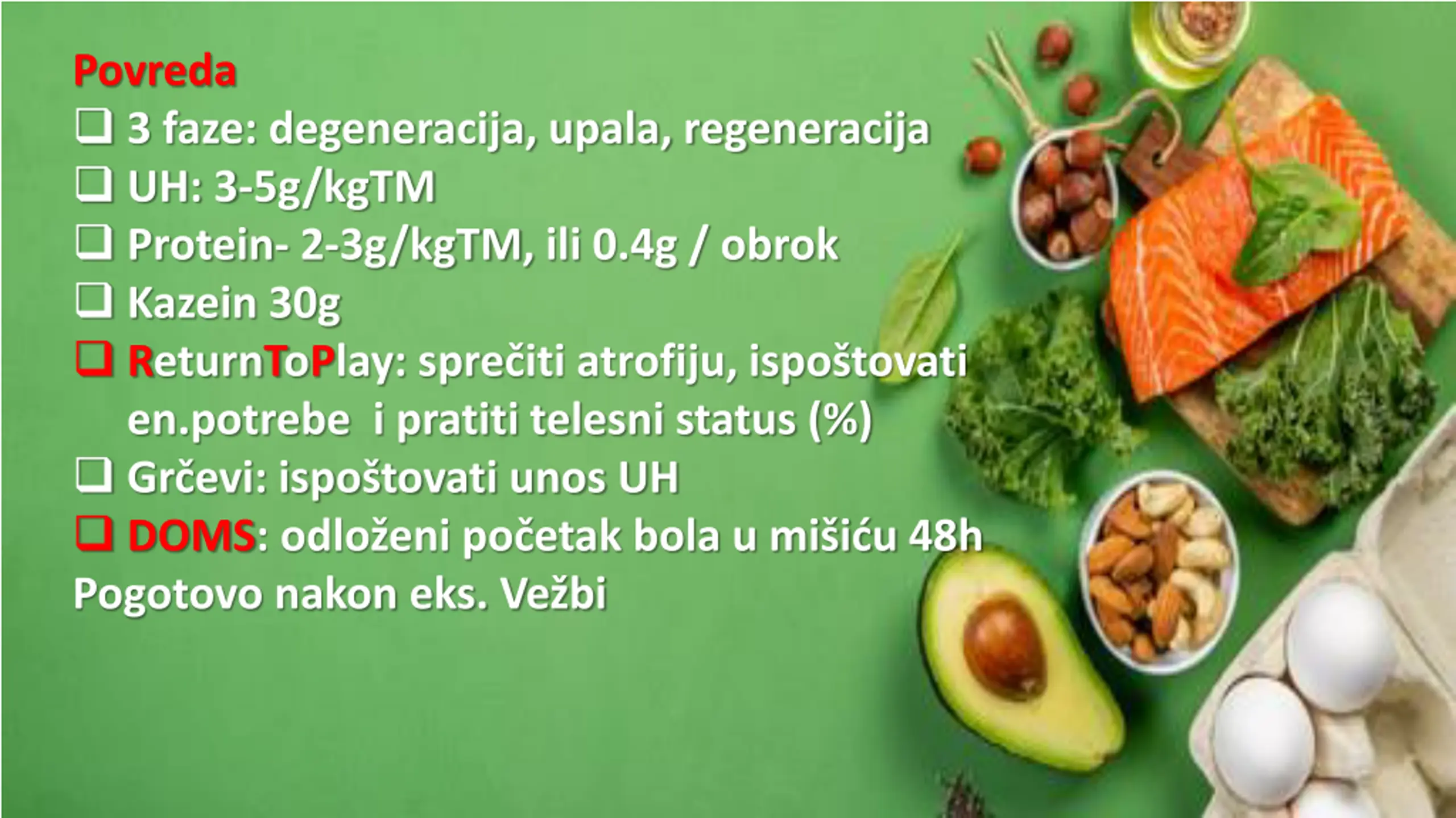10. Povreda  3 faze: degeneracija, upala, regeneracija  UH: 3-5g/kgTM  Protein- 2-3g/kgTM, ili 0.4g / obrok  Kazein 30g  ReturnToPlay: sprečiti atrofiju, ispoštovati en.potrebe i pratiti telesni status (%)  Grčevi: ispoštovati unos UH  DOMS: odloženi početak bola u mišiću 48h Pogotovo nakon eks. Vežbi