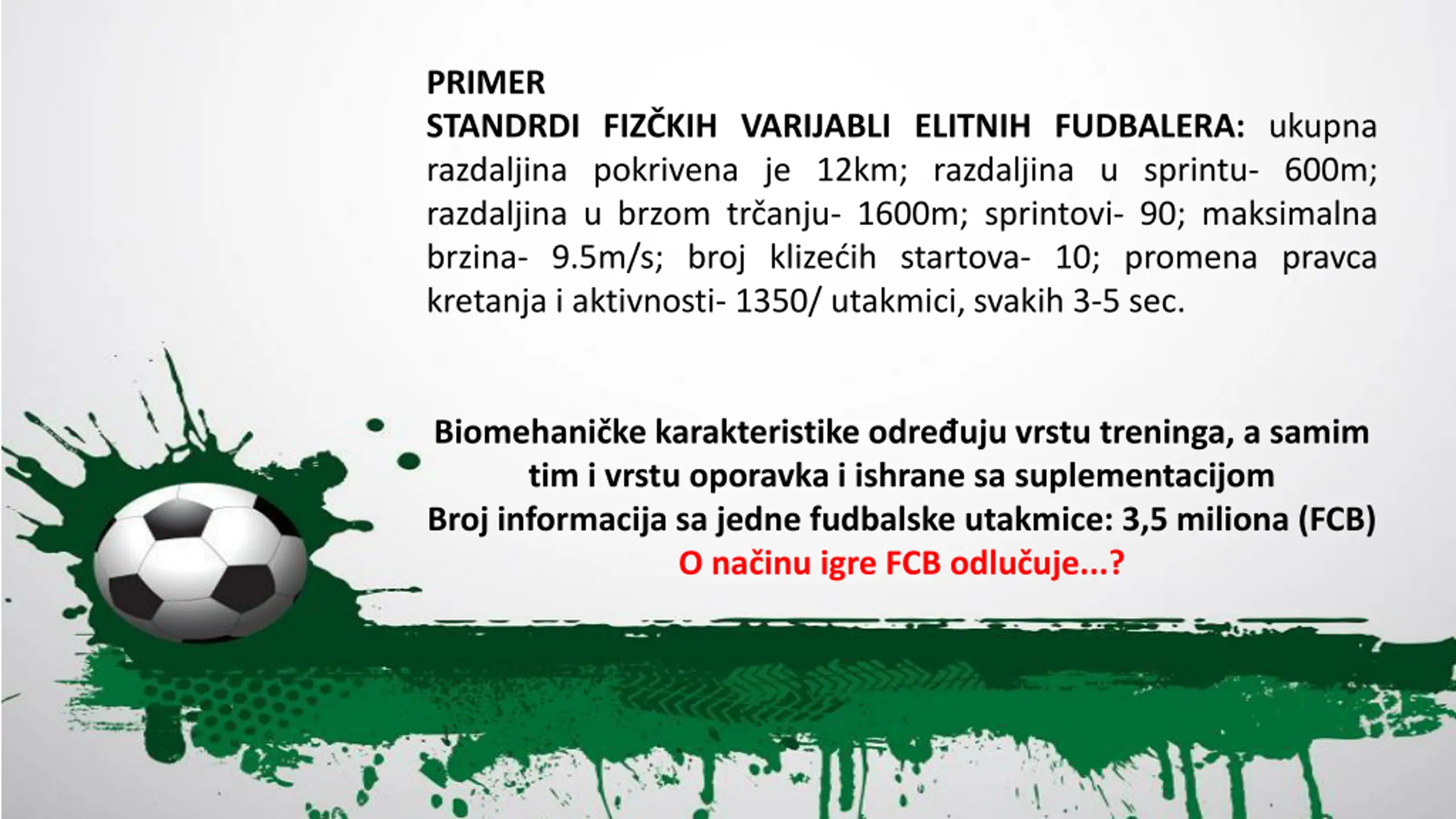 15. PRIMER STANDRDI FIZČKIH VARIJABLI ELITNIH FUDBALERA: ukupna razdaljina pokrivena je 12km; razdaljina u sprintu- 600m; razdaljina u brzom trčanju- 1600m; sprintovi- 90; maksimalna brzina- 9.5m/s; broj klizećih startova- 10; promena pravca kretanja i aktivnosti- 1350/ utakmici, svakih 3-5 sec. Biomehaničke karakteristike određuju vrstu treninga, a samim tim i vrstu oporavka i ishrane sa suplementacijom Broj informacija sa jedne fudbalske utakmice: 3,5 miliona (FCB) O načinu igre FCB odlučuje...?