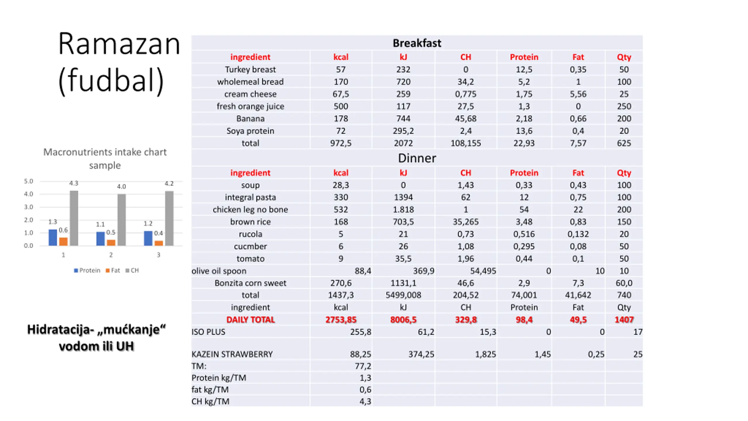 16. Ramazan (fudbal) Breakfast kJ 232 720 259 117 744 295,2 2072 Dinner kJ 0 1394 1.818 703,5 21 26 35,5 369,9 1131,1 5499,008 kJ 8006,5 ingredient Turkey breast wholemeal bread cream cheese fresh orange juice Banana Soya protein total kcal 57 170 67,5 500 178 72 972,5 CH 0 34,2 0,775 27,5 45,68 2,4 108,155 Protein 12,5 5,2 1,75 1,3 2,18 13,6 22,93 Fat 0,35 1 5,56 0 0,66 0,4 7,57 Qty 50 100 25 250 200 20 625 Macronutrients intake chart sample ingredient soup integral pasta chicken leg no bone brown rice rucola cucmber tomato olive oil spoon Bonzita corn sweet kcal 28,3 330 532 168 5 6 9 CH 1,43 62 1 35,265 0,73 1,08 1,96 Protein 0,33 12 54 3,48 0,516 0,295 0,44 Fat 0,43 0,75 22 0,83 0,132 0,08 0,1 Qty 100 100 200 150 20 50 50 10 60,0 740 Qty 1407 5.0 4.3 4.2 4.0 4.0 3.0 2.0 1.3 1.2 1.1 0.6 0.5 1.0 0.4 0.0 1 2 3 88,4 54,495 46,6 204,52 CH 329,8 0 10 Protein Fat CH 270,6 1437,3 kcal 2753,85 2,9 7,3 total 74,001 Protein 98,4 41,642 Fat 49,5 ingredient DAILY TOTAL Hidratacija- „mućkanje“ vodom ili UH ISO PLUS 255,8 61,2 15,3 0 0 17 KAZEIN STRAWBERRY TM: Protein kg/TM fat kg/TM CH kg/TM 88,25 77,2 1,3 0,6 4,3 374,25 1,825 1,45 0,25 25