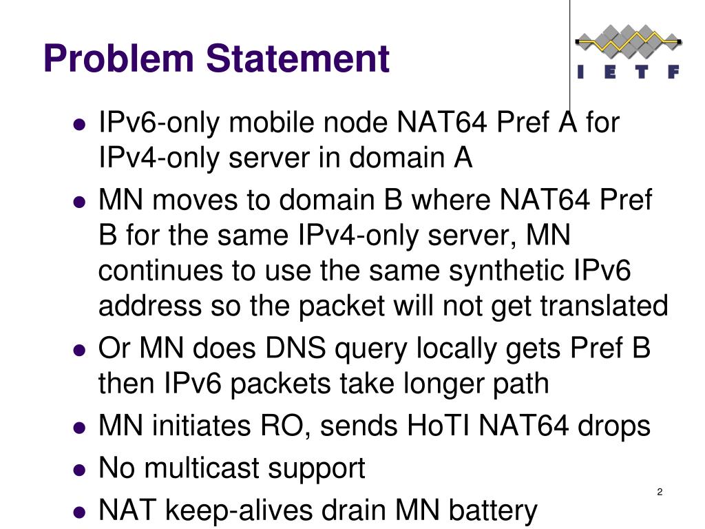Problem Statement IPv6-only mobile node NAT64 Pref A for IPv4-only server in domain A MN moves to domain B where NAT64 Pref B for the same IPv4-only server, MN continues to use the same synthetic IPv6 address so the packet will not get translated Or MN does DNS query locally gets Pref B then IPv6 packets take longer path MN initiates RO, sends HoTI NAT64 drops No multicast support NAT keep-alives drain MN battery