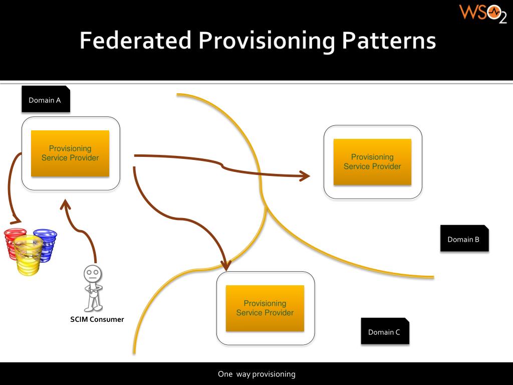Federated Provisioning Patterns Domain A Provisioning Service Provider Provisioning Service Provider Domain B Provisioning Service Provider SCIM Consumer Domain C One way provisioning